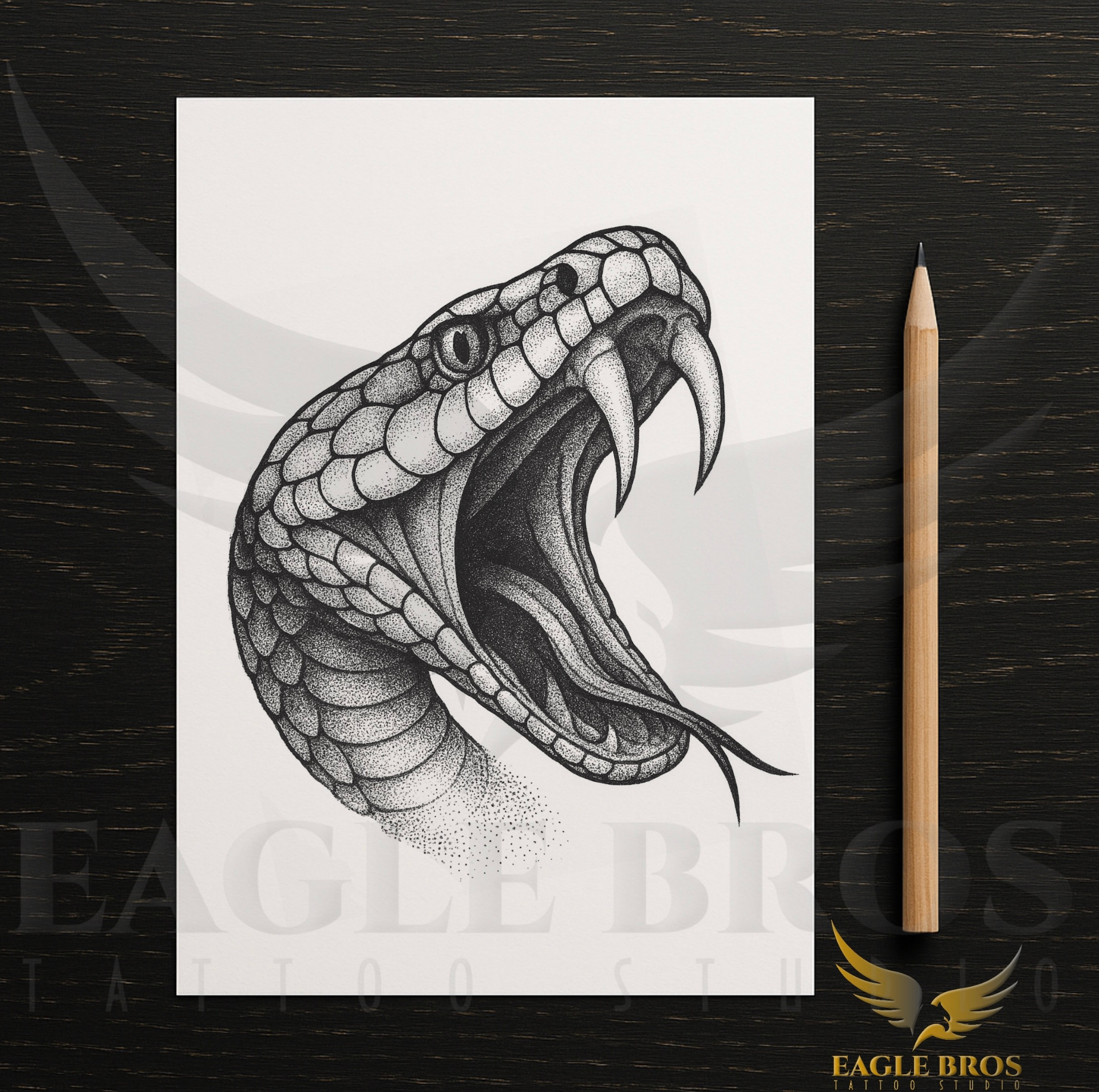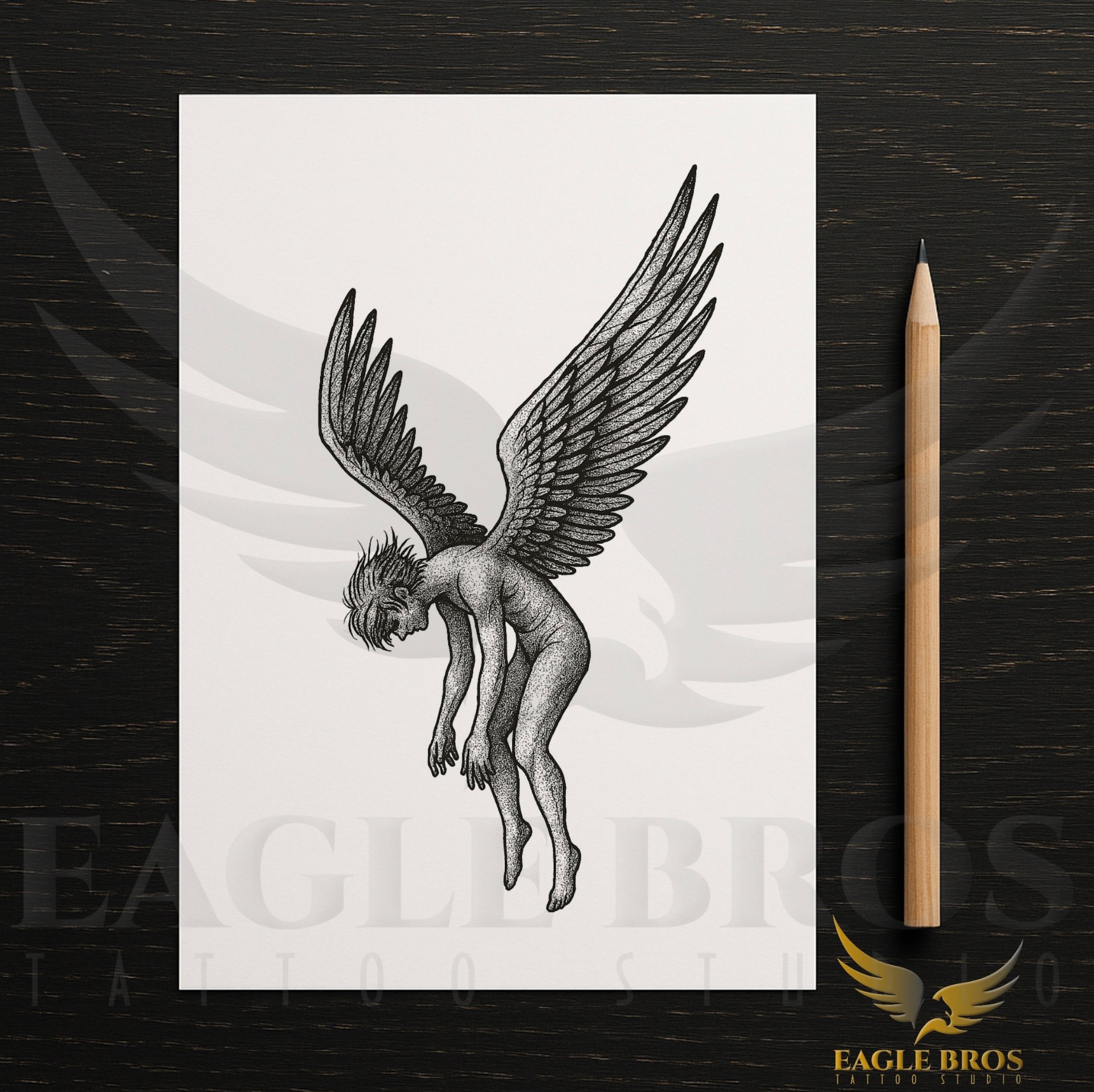 Symbol pádu, pokory a znovuzrodenia. Dotwork štýl s výraznou siluetou krídel a liniek vytvára silný kontranst.